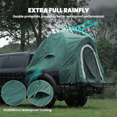 【Convenient Storage&Complete Accessories】The tent features two storage pockets beneath the windows on either side, making it easy to organize small items and keep the interior tidy. It pairs perfectly with an air mattress (sold separately)ing experience above the ground for greater stability and safety compared to standard tents. Finally, the package includes: Truck tent, rainfly, portable carrying bag, pole storage bag, 6 fiberglass poles (including 2 spares), a spare rubber strap, and an integrated manual. With solid materials and meticulous craftsmanship, it’s easy to store and ready to kickstart your outdoor adventure